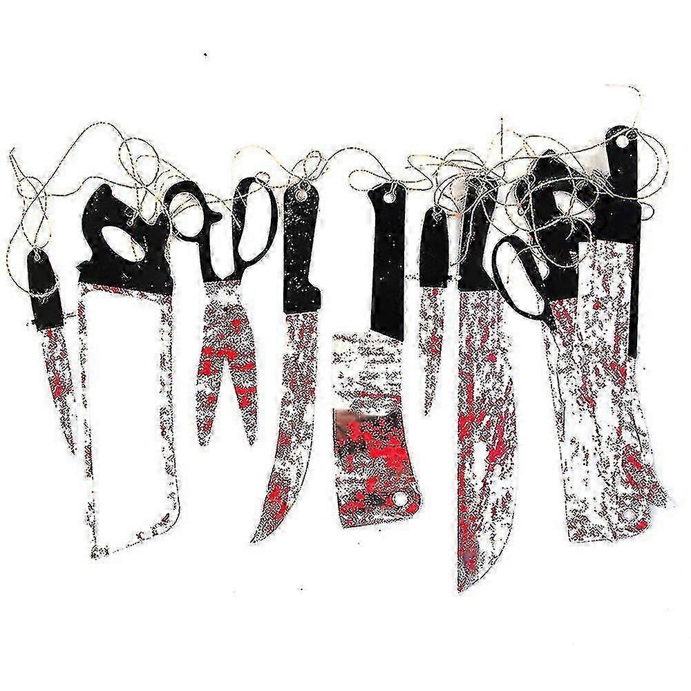 Halloween Party Bloody Weapon Haunted House Scary Banner Hangings DecorMaterial: PaperSize: 20cmx1.5cmA scary Halloween banner with 12 assorted cutter models, can be used as haunted house decoration.Clearly printed pictures, giving a spooky and authentic effects.Package Included: 12 x Cutter Models