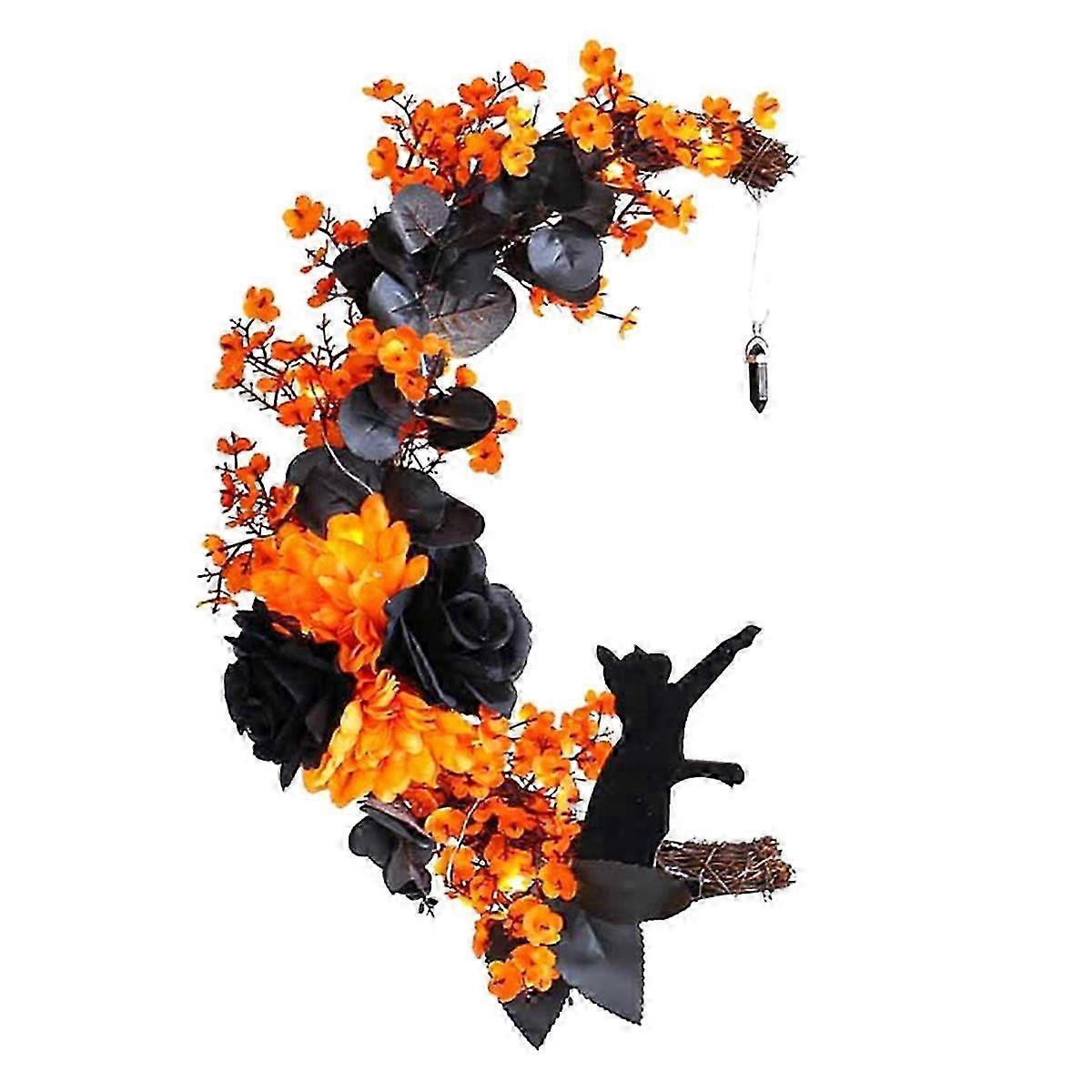 Halloween Moon Door Wreath Light-Up Cat Garland with Black Rose&Yellow Flowers for Front Door Favor