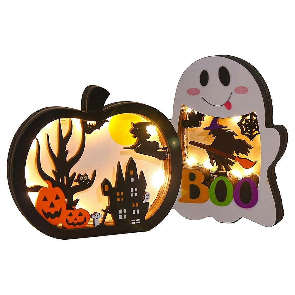 Halloween Wooden Lighted Pumpkin for Tabletop 2pcs Light Up Pumpkin Ghost Lamp Shadow Box Halloween