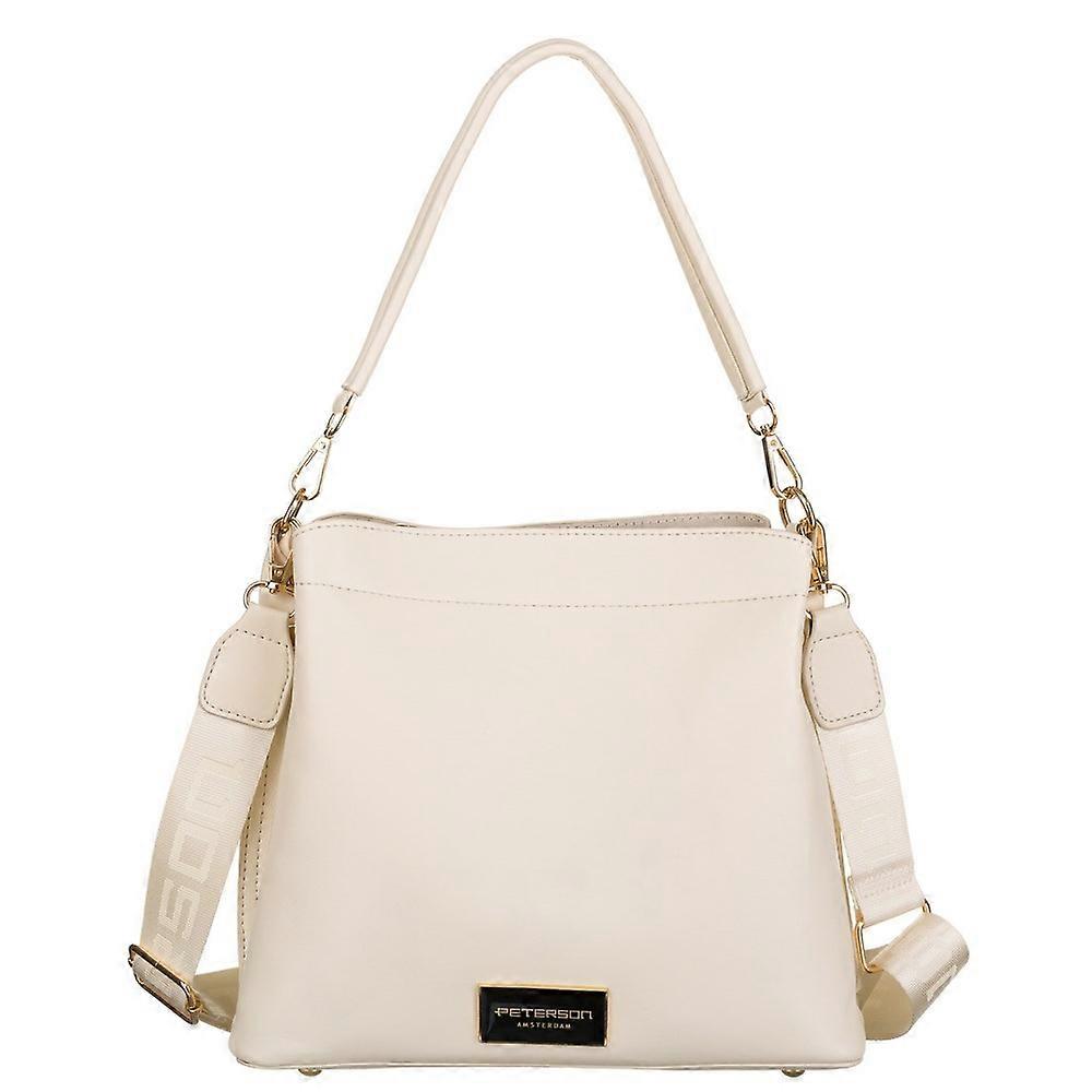 White women's handbag, eco-leather, Peterson, tote bag or shoulder bag ️⃣ A brand with traditions | A product from a renowned Polish brand distinguished by its unique style and high-quality craftsmanship. ️⃣ Material and workmanship | Made of high-quality eco-leather with a smooth texture. Meticulously crafted, this bag will last for years. ️⃣Elegant design | Fashionable colors combined with gold hardware make this bag a perfect complement to your outfit. ️⃣ Small, light, and handy | The bag will hold the most essentials, like a wallet or phone. Equipped with 2 compartments and 2 pockets. ️⃣ Solid finish | The interior is finished with a fabric lining. This finish is essential if you want the interior of your messenger bag to remain in pristine condition for years to come ️⃣ Convenience and comfort of carrying | The bag comes with a detachable long strap and a short handle.Interior organizationThe bag has 1 double compartment, divided by a zippered compartment. It also features a zipped pocket. The entire bag is lined with fabric to protect the faux leather from damage when putting things in and taking them out.This small bag will easily fit the most essential items, such as:➡️ wallet➡️ phone➡️ keys➡️ lipstick and lip gloss➡️ tissuesand many other small items you need every day. Two ways to carryThe bag comes with two carrying accessories attached with carabiners.✅Long, adjustable webbing strap, 3.8 cm wide, with a maximum length of 130 cm cm✅ 50 cm long handle made of eco-leatherDecide how you prefer to carry it  Protective FeetFour protective feet are located on the bottom of the bag. They not only protect the material from damage, but also ensure stability when placing it on the ground.