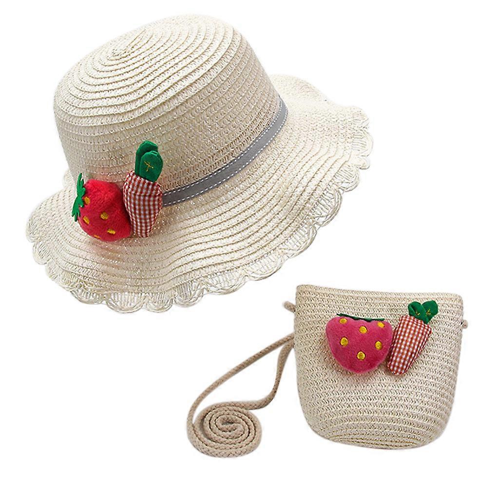 Kids Summer Straw for Sun Hat with Handbag Cartoon Rabbit Pompom Vacation Beach