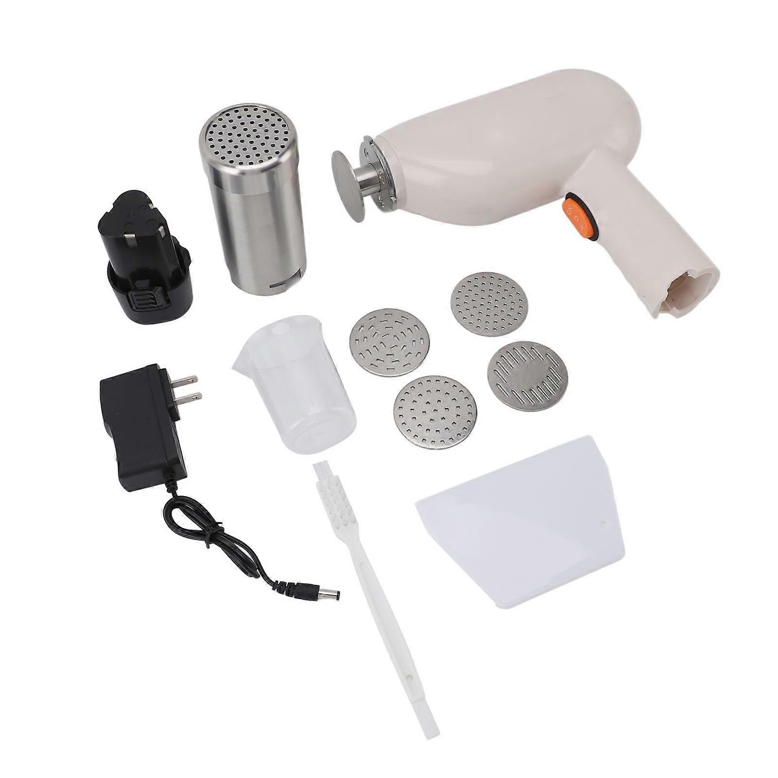 Features: 1Versatility: This pasta machine can produce a variety of pasta types catering to your every pasta craving with convenience and speed. 2Labor Saving Efficiency: Our pasta maker speeds up pasta making with its electric design making it an effortless task to create delectable homemade noodles. 3Compact and Portable: The pasta maker is small lightweight and easy to store. It doesn't occupy much space making it perfect for every kitchen. 4Adjustable Thickness: With its multi functional design you can adjust the thickness of your pasta to meet your taste preference creating a unique pasta experience at home. 5Superb Pasta Quality: The efficient press ensures each pasta strand is delicately made securing a delicious taste in your cuisine making. Specification: Item Type: HandheldElectricPastaMakerMaterial: Stainless SteelBattery Type: Lithium Battery (Shipped with Matching Battery)Battery Model: LI-ionBattery Capacity: 1500mAhRated Capacity: 200gWeight: Approx. 1728.00g / 60.95oz Package List: 1 x Set of Noodle Maker (9 accessories)1 x Battery1 x Plug