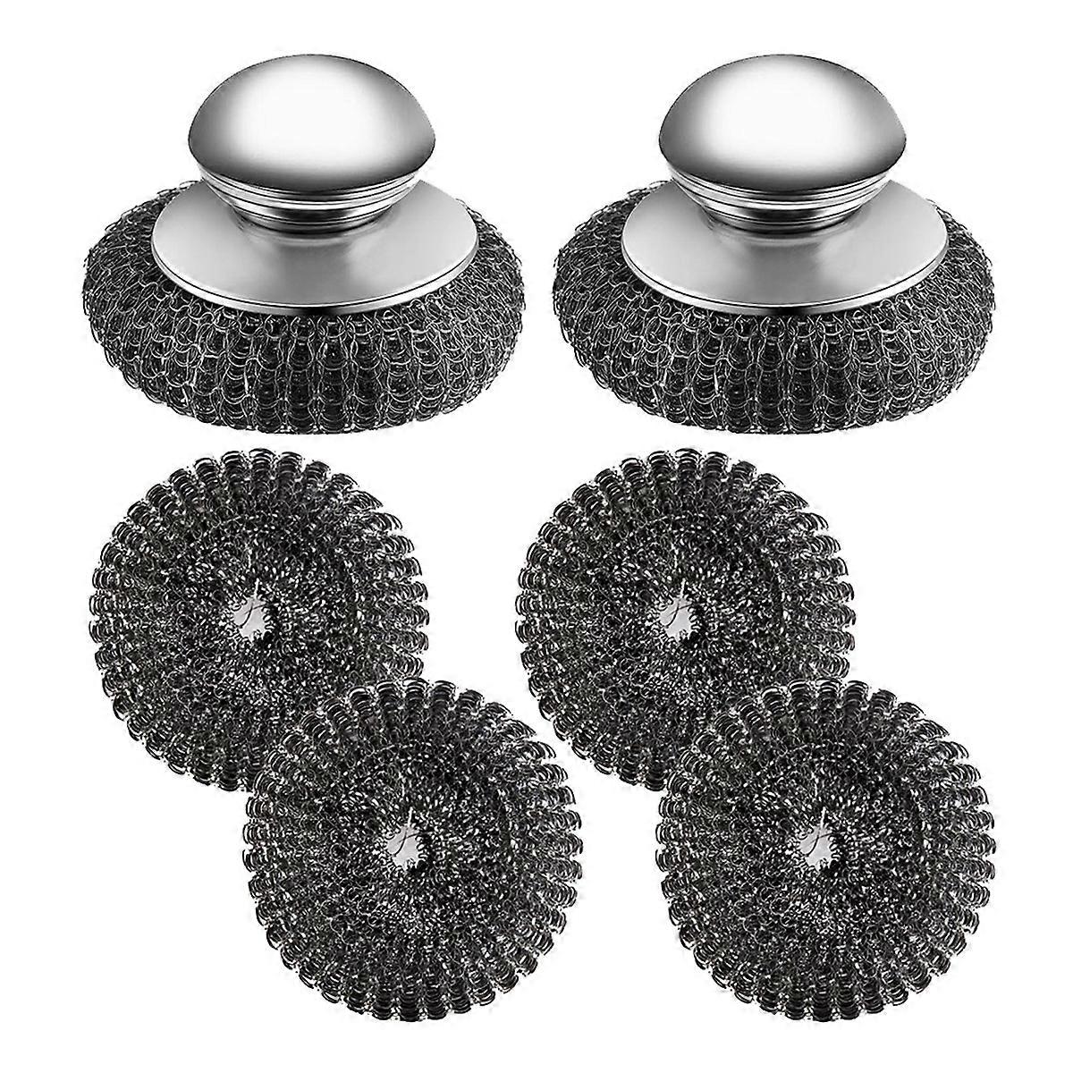 2Pcs Stainless Steel Scrubber with Handle, 4 Replacement Scrubber,for Cleaning Cast Iron, Dishes, Kitchen Pots, Grills