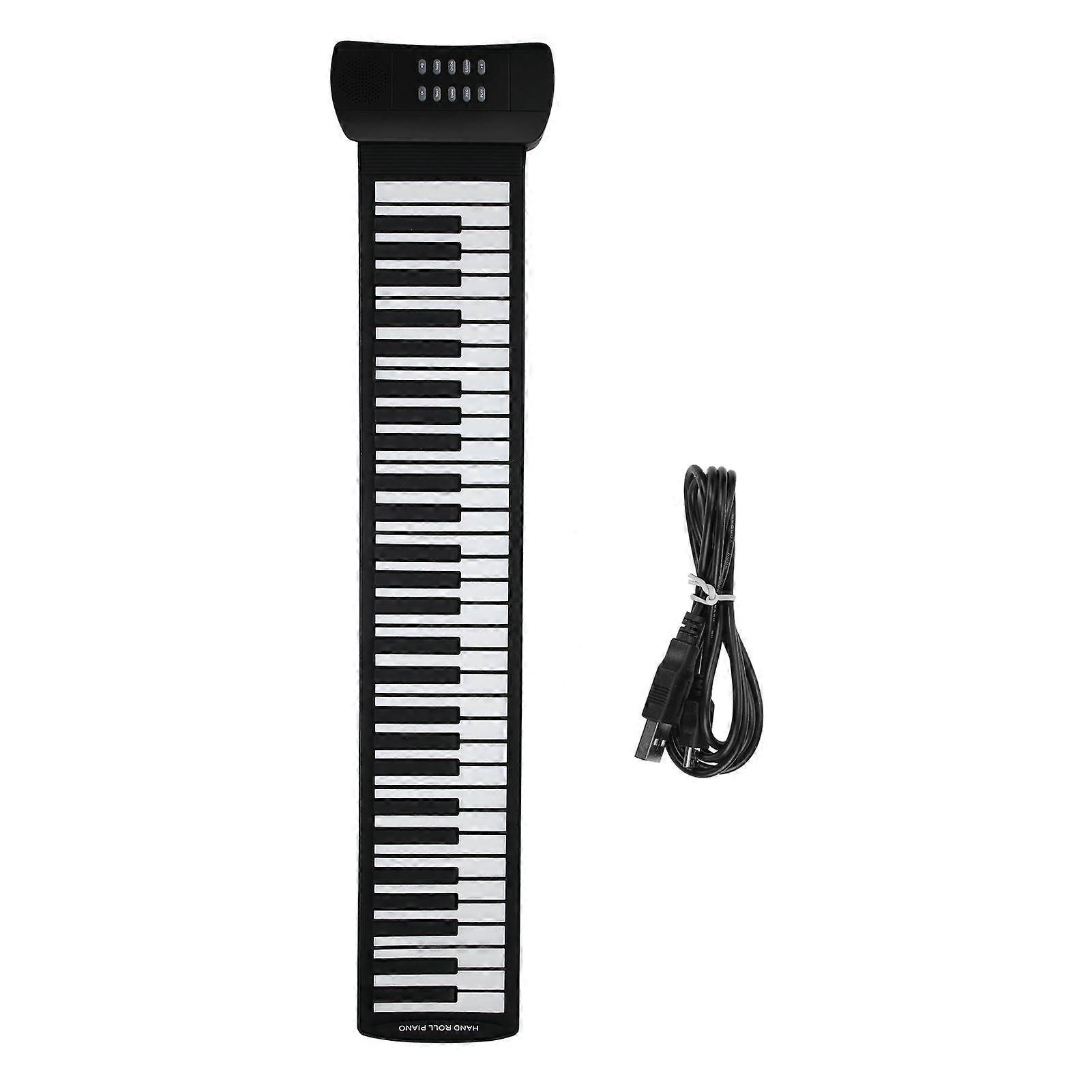 Feature:1. This hand-rolled piano is 61-key and adopts an imitation piano key design. The silicone material makes the playing feel more comfortable.2. The piano is a portable and foldable design, which does not take up any space when in use and is easy to store.3. The hand-rolled piano has a recording function. Press the REC button to start recording, and the maximum number of recordings is 65.4. With teaching function, press the OKON button to enter the teaching mode, and then press the white button to select different songs.5. Designed with a headphone port, it will not disturb the people when playing, and the port can also be connected to a stereo and a tablet.Specification:Item Type: Hand Roll PianoMaterial: Natural Silicone + ABSColor: Black and whitePower Supply: USB power supply/3 x AAA battery(not included)Power Input: DC5V/1000mAOutput Power: 500mWTones: 16 kinds of tones/6 demo songsFunction: Recording, playback, start/stop functionSpeaker: Built-in stereo speaker, can be used as audioConnected Devices: Support external speakers, headphones, tabletsPiano Unfolded Size: Approx. 100 x 22.5cm / 39.4 x 8.9in.Package List:1 x Hand Roll Piano1 x USB Cable1 x English User ManualNote:1. When the hand‑rolled piano is not in use, remove the battery from the battery box to prevent battery leakage from damaging the product.2. When using it, lay the hand‑rolled piano flat, do not place the hand‑rolled piano on an uneven place, and do not move the hand‑rolled piano at will during the performance, otherwise it will affect and damage the normal function of the hand‑rolled piano.3. After the hand‑rolled piano is used, it should not be rolled too tightly when it is rolled up and retracted, and the normal function of the button will be damaged and the service life of the button will be shortened!4. Do not pull or twist the keyboard of the hand‑rolled piano. Do not place the piano roll in a hot or humid place.5. No part of the hand‑rolled piano can be split.6. Do not place the hand‑rolled piano in a place with strong electric waves, so as not to affect the function of the hand‑rolled piano.