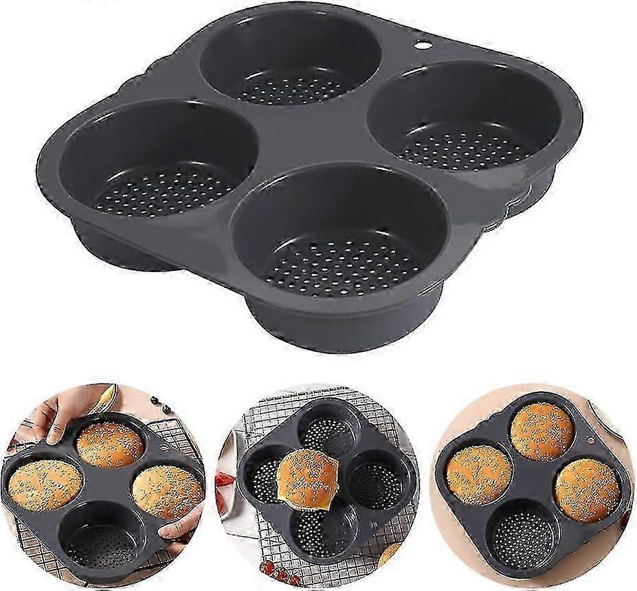 Hamburger Bun Mold 4 Cavity Loaf Pan, Mesh Hamburger Bun Mold for Making Buns, Non Stick Baking Pan Household Food Baking New Baking Tool (Gray)