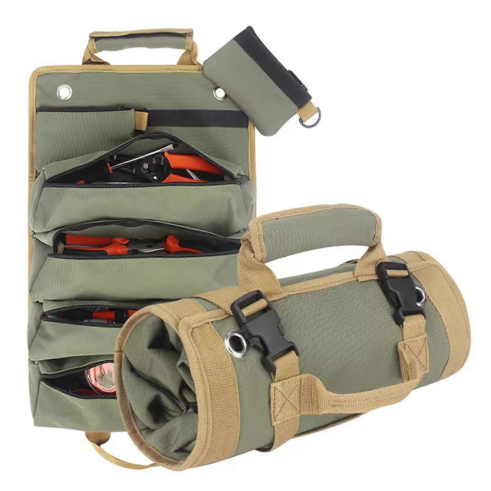 Hardware Tool Bag Portable Roll Up Tool Organizer Oxford Cloth Storage Bag with 2 Detachable Pouches Green