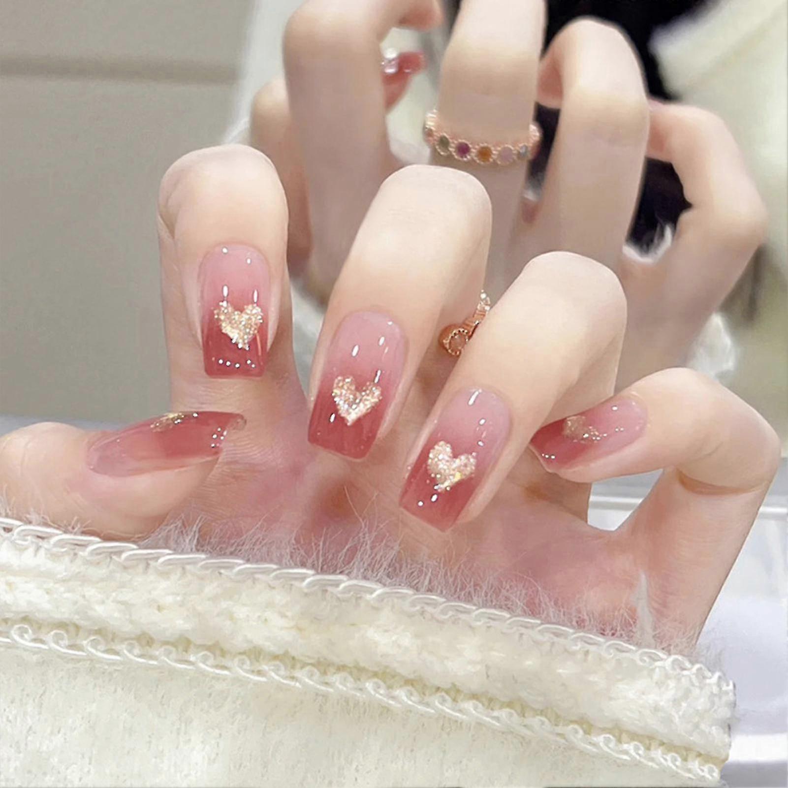 Heart Pattern Press-on Nails Comfortable Wear Blush Nail Art False Nails For Finger Nail Diy At Home Bonus: Get a free professional-grade nail file w