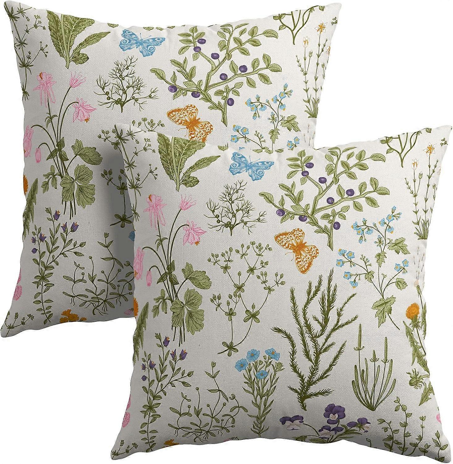 Herbs Wildflowers Pillow Covers 18x18 Inches Botanical Floral Butterfly Throw Pillow Case Set of 2 Spring Flower Pillow Cover Cotton Linen Cushion Cov