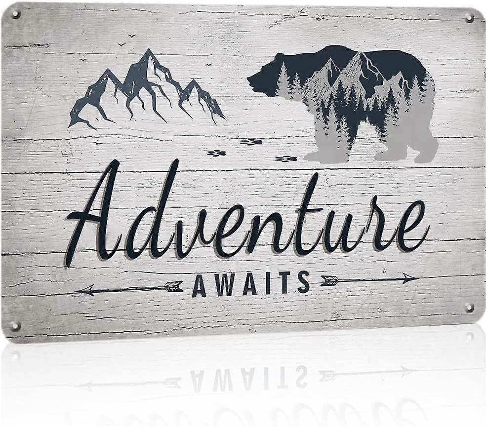 Vintage Adventure Travel Rustic Metal Sign with Bear Mountain Shaped, Adventure Awaits Bear Decor Tin Sign Wall Decor, 12 x 8 Inches