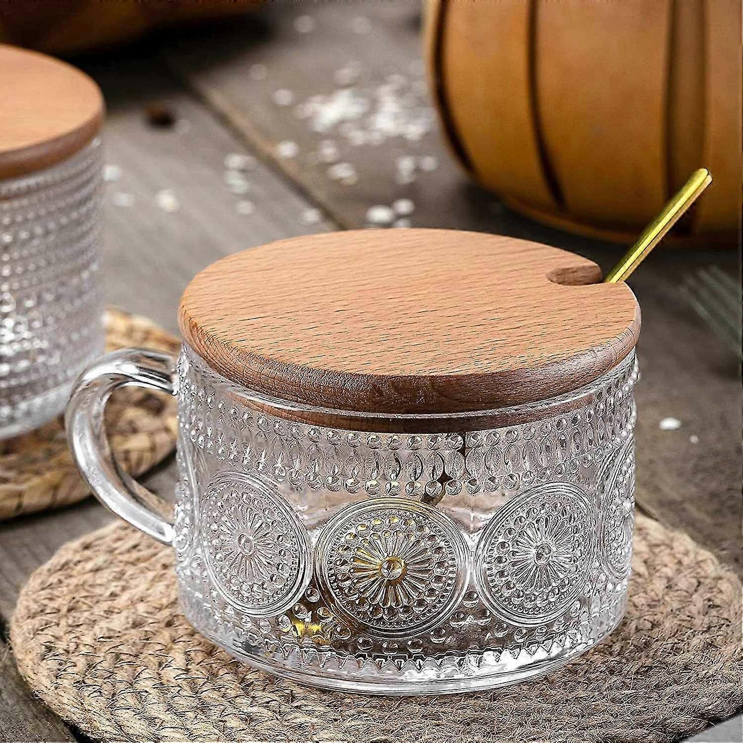 Vintage Glass Coffee Mugs, Overnight Oats Containers with Bamboo Lids and Spoons, 14oz Slight Green
