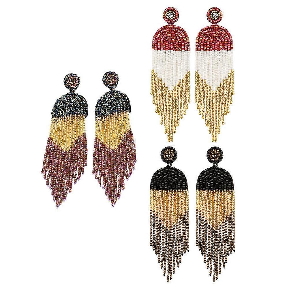 Bead Earring Ladies Dangle Earrings Bohemian Dangle Earrings Ethnic Ear Jewelry Red 11.5X3.5CM Beaded Tassel 3 Pairs