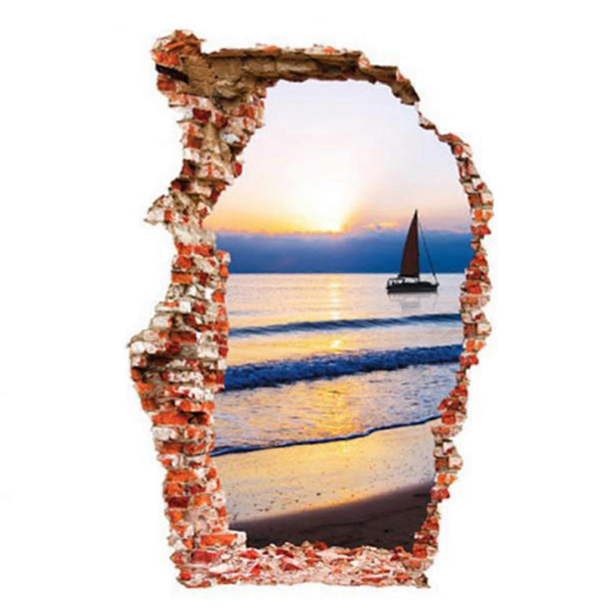 Beach Sunset Scene, Removable Break Through The Wall Vinyl Wall Sticker, Mural Art Decals For Boys Room Decor, Quick And Easy Paste Without Damage