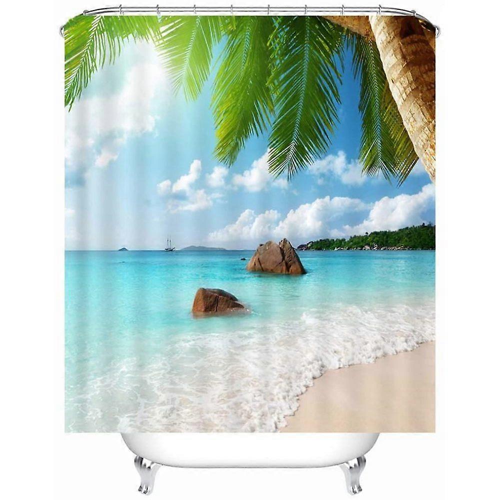 Beach motif shower curtain, waterproof fabric anti-mold incl, Shower curtain rings washable bathtub curtain