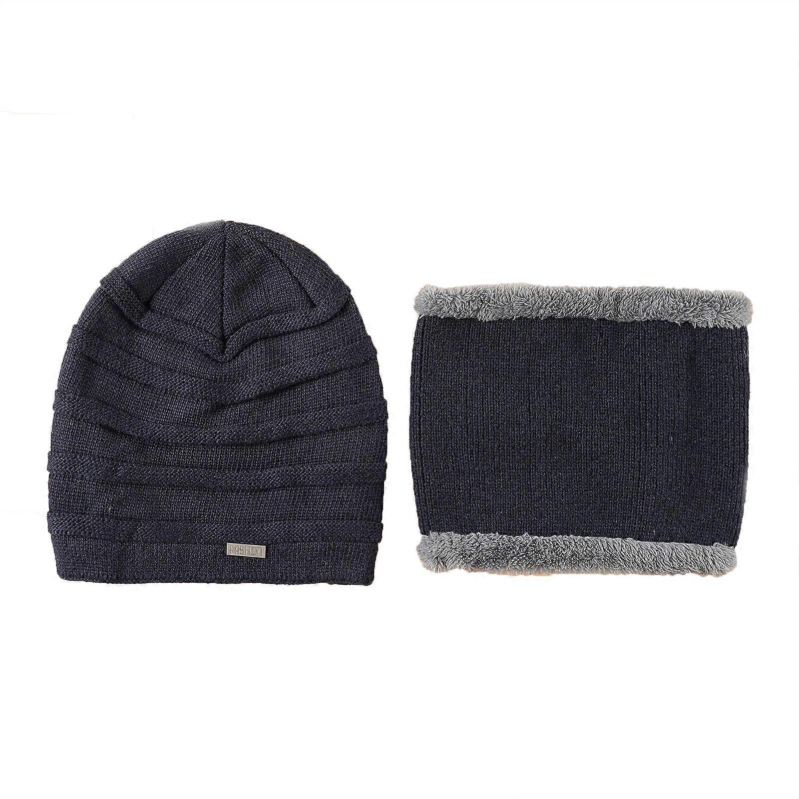 Beanie Scarf Set Men Winter Caps Cover Ears Winter Skullies Hat Wool Beanies Knitted Hat Scarf With Lining Navy Blue