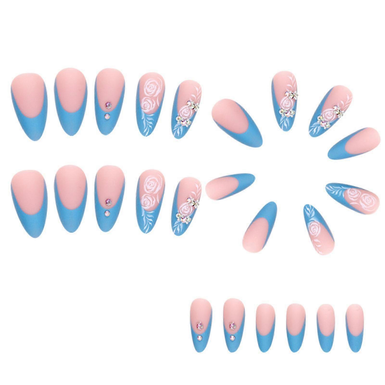 Pink With Blue Tip Rhinestone Setting Fake Nails Ultra-flexible Long Lasting Fake Nails