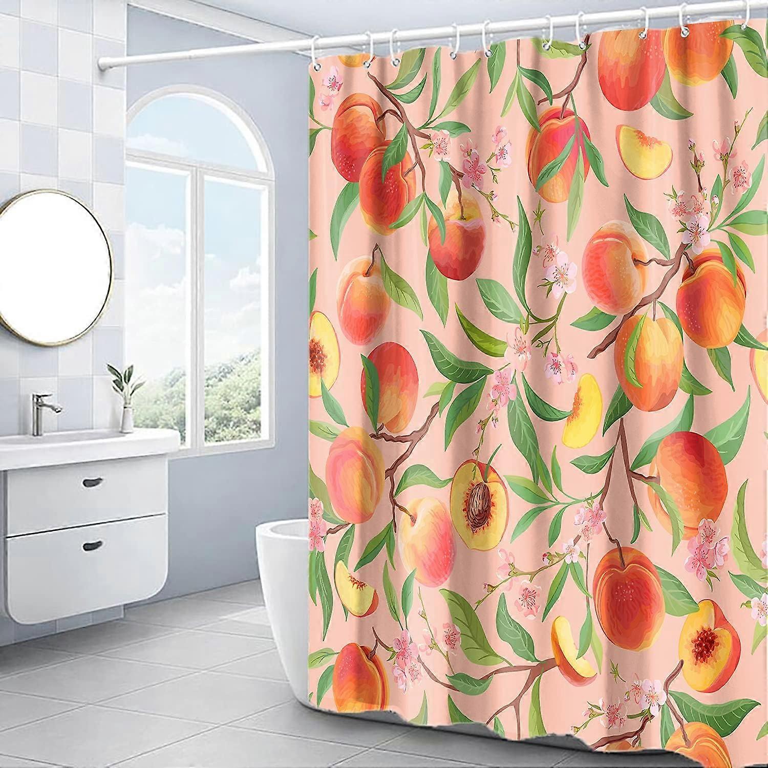 Pink Cute Peach Shower Curtain Orange Fruit Floral Colorful Bathroom Curtains Set Waterproof Fabric with 12 Hooks (72 * 72inch/180cm*180cm)