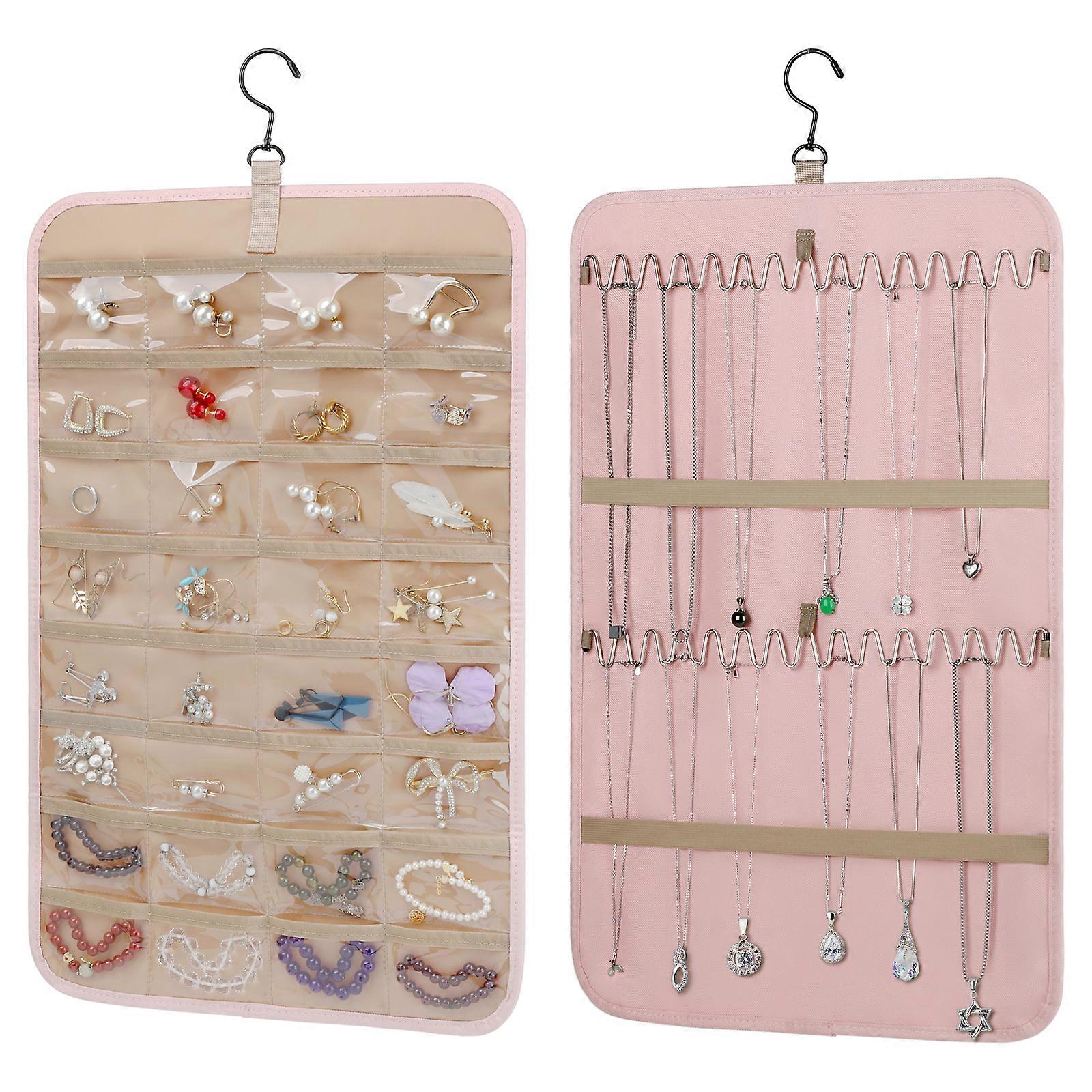 Pink Hanging Jewelry Organizer, Necklace Holder Anti-tangle Earrings Rings Hanger with Jewelry Bags Travel Storage Roll