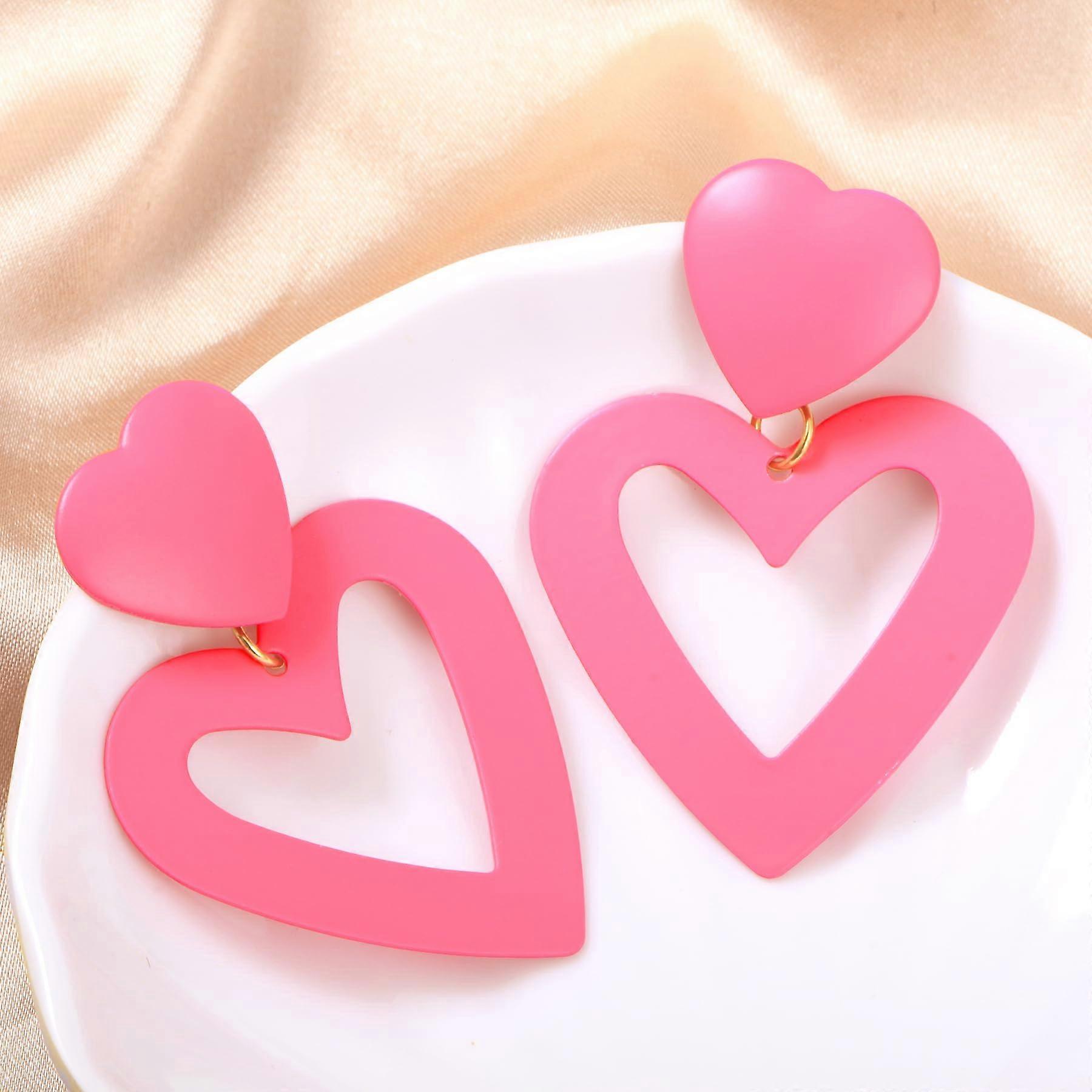 Pink Heart Earrings, Big Heart Dangle Earrings Hot Pink Earrings for Women Pink Statement Earrings Gift for Valentine's Day