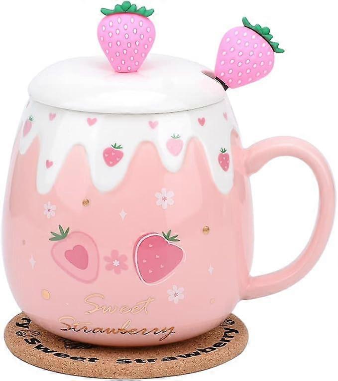 Pink Mug, Cute Strawberry Mug with Lid and Spoon, Ceramic Coffee Mug, Kawaii Mug, Women, Girls, Students, Korean Style, 450ml, Christmas, Birthday Gif