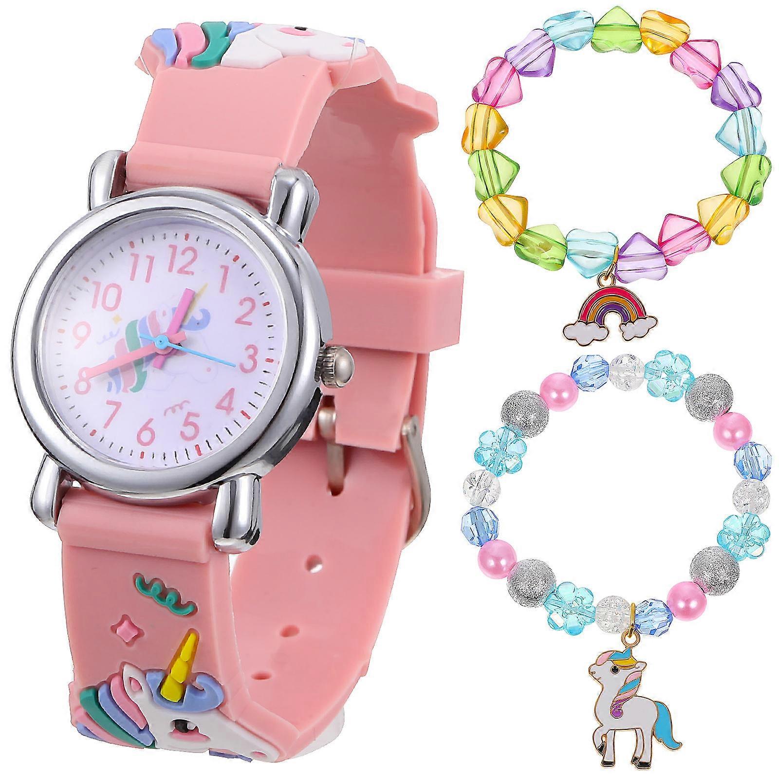 Rainbow Strap Watch with Pink Unicorn Quartz Movement, Pearl and Heart Beaded Bracelet Set – Stylish Jewelry for Birthdays and Christmas