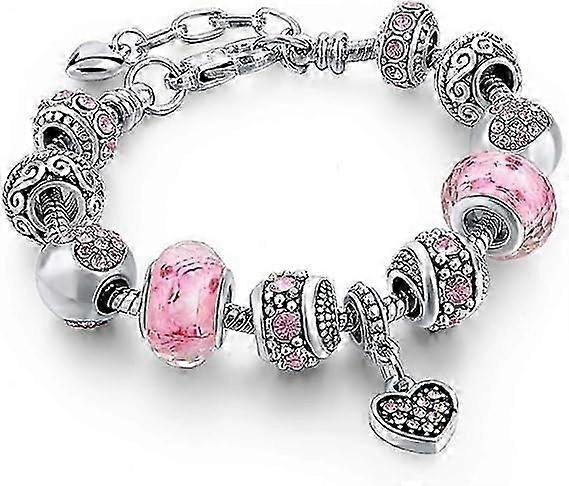 Pink Heart Silver Plated Bracelet Set, Jewelry Gift, Comes with Beads, Pendant and Adjustable Snake Chain, Fits 7.5" + 1.5", Pink
