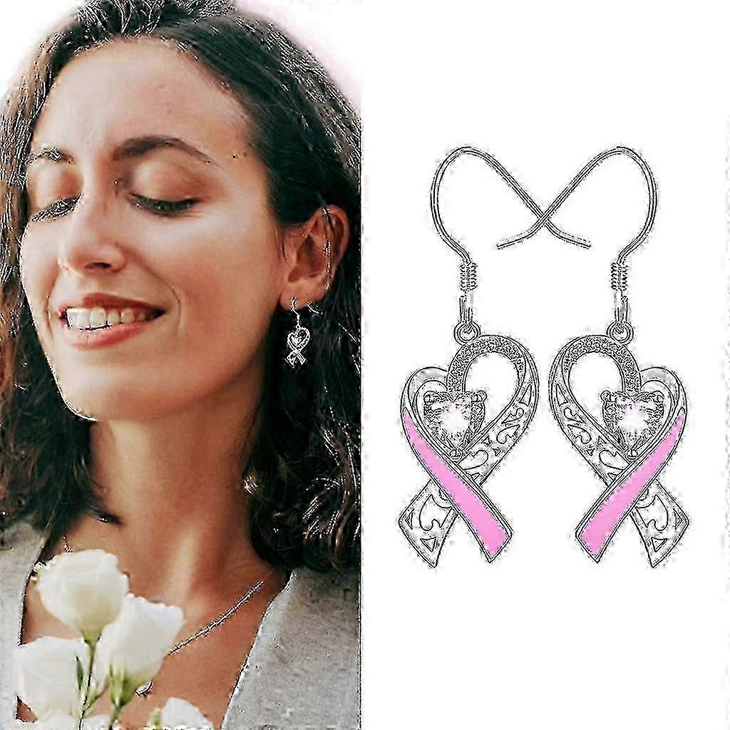 Pink Heart Ribbon Dangle Drop Pierced Earrings Themed Breast Cancer Awareness