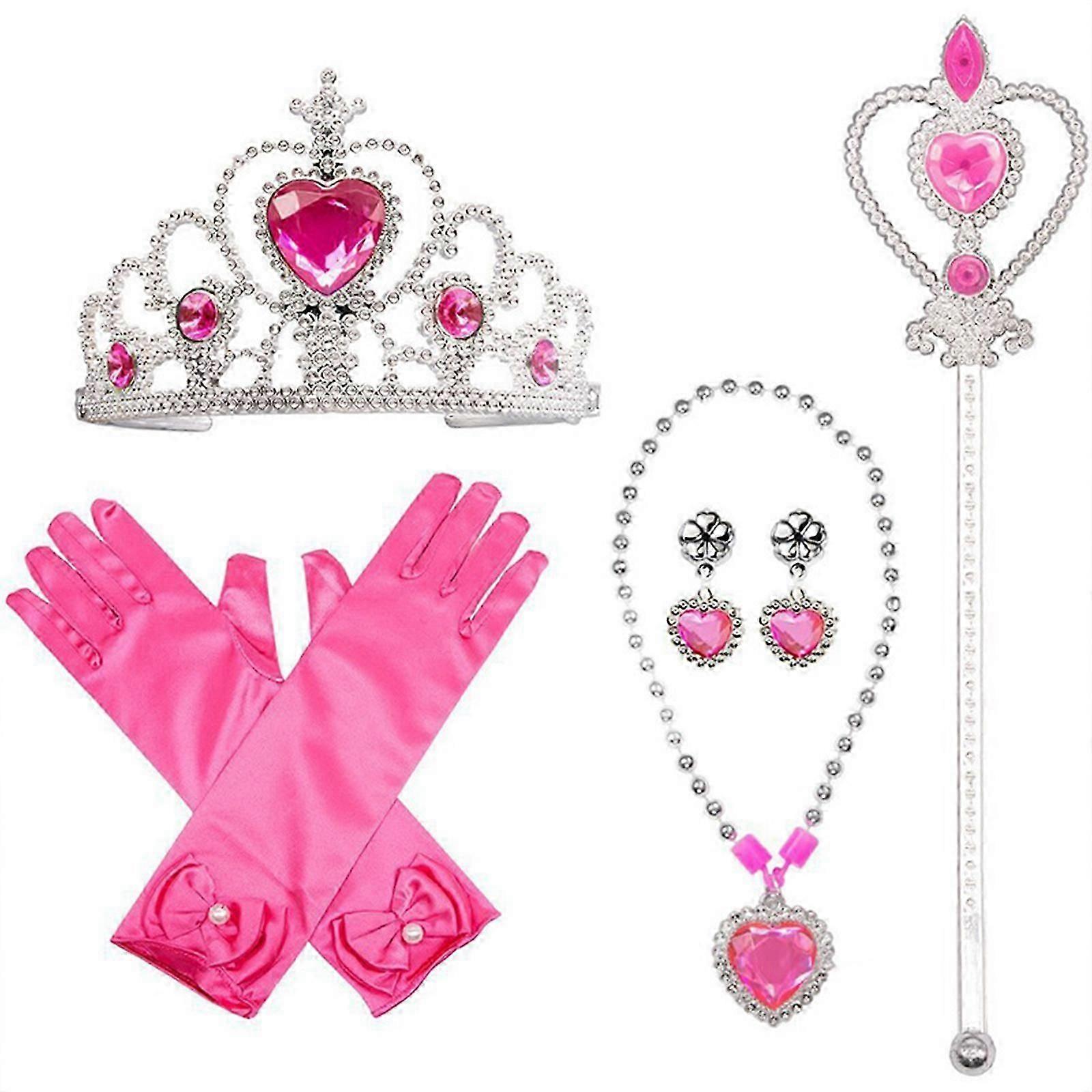 Pink Princess Dress up Accessories 5 Pieces Gift Set for Brabie Crown Scepter Necklace Earrings Gloves for Gilrs