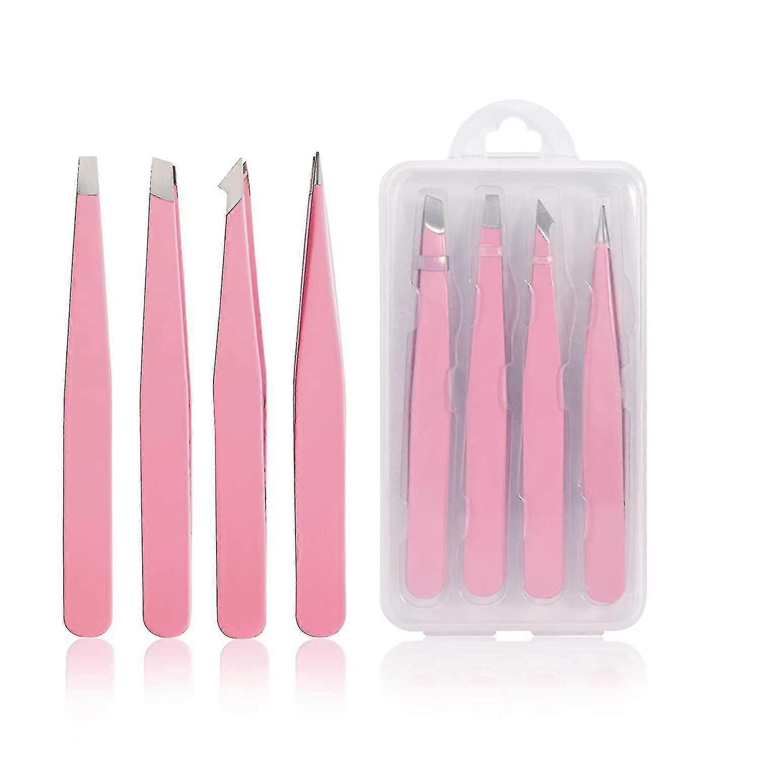 Multiuse-4 in 1 Set:4 different professional precision tweezers are included in this kit: Slant tweezers,Pointed tweezers,Pointed-Slant tweezers,Flat tweezers.They can not only work well for plucking eyebrows precisely, but also perfect for false lashes and double eyelid affixing^Superior Quality:Made of high-quality stainless steel.Each individual tweezers tip is hand-filed,sharpened,assembled and adjusted for accuracy.It's durable, rust-proof, cause no irritation in contact with skin and easy to clean.It will never rust or tarnish^Safe & Precision:These eyebrow tweezers are germ-free and no chemical. You can pluck eyebrow hairs, ingrown hairs, facial hairs, splinters, and even the smallest individual hair . It will not cut, split, break or damage the unwanted hairs forcing you to pull at the same hairs over and over again^Easy to Carry:The transparent box make this professional tweezers set great for usage,each tweezers has a individual area to keep eyebrow tweezers clean and not as easy to lose.The box is portable and lightweight that slips easily into pocket, purse,gym bag,Stylish with convenient travel case
