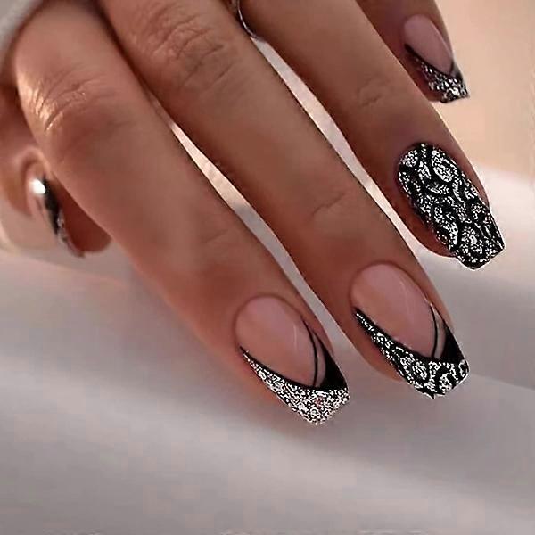 Leopard False Nails Black and Silver Glitter Fake Nails Short Press on Nails for Women and Girls