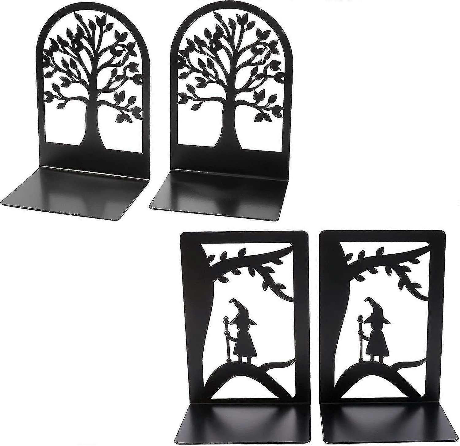 Metal MaterialHeavy duty metal bookends made of sturdy metal and advanced technology, strong enough to support books neatly, upright and not easy to bend. Perfect for storing large books, DVDs, video games or CDs Rubber Anti-ip BottomThe bottom is filled with rubber, place them on your favorite shelf and they won't damage the surface at all. The corners are ightly rounded so they won't scratch your fingers or booksHigh Performance Black Bookshelf measuring 4.7 * 7 * 4.7 inches, it can hold a variety of book sizes, no matter how many books you place. These book stop support kits can easily and neatly support your books to keep your desk neat and tidy, as well as avoid mess and improve office efficiency. Another great advantage of the Simple Bookstop is the space saved on the shelf, as there is no extra end sticking out the other side.Elegant designthe bookshelf is designed with an openwork tree shape that not only supports your books, but also decorates your desk or bookshelfGood GiftBooks are an ideal gift choice for students, nerds and office workers. If you have any questions about your purchase, please feel free to contact us and we'll do our best to make it right.Heavy-duty metal bookends