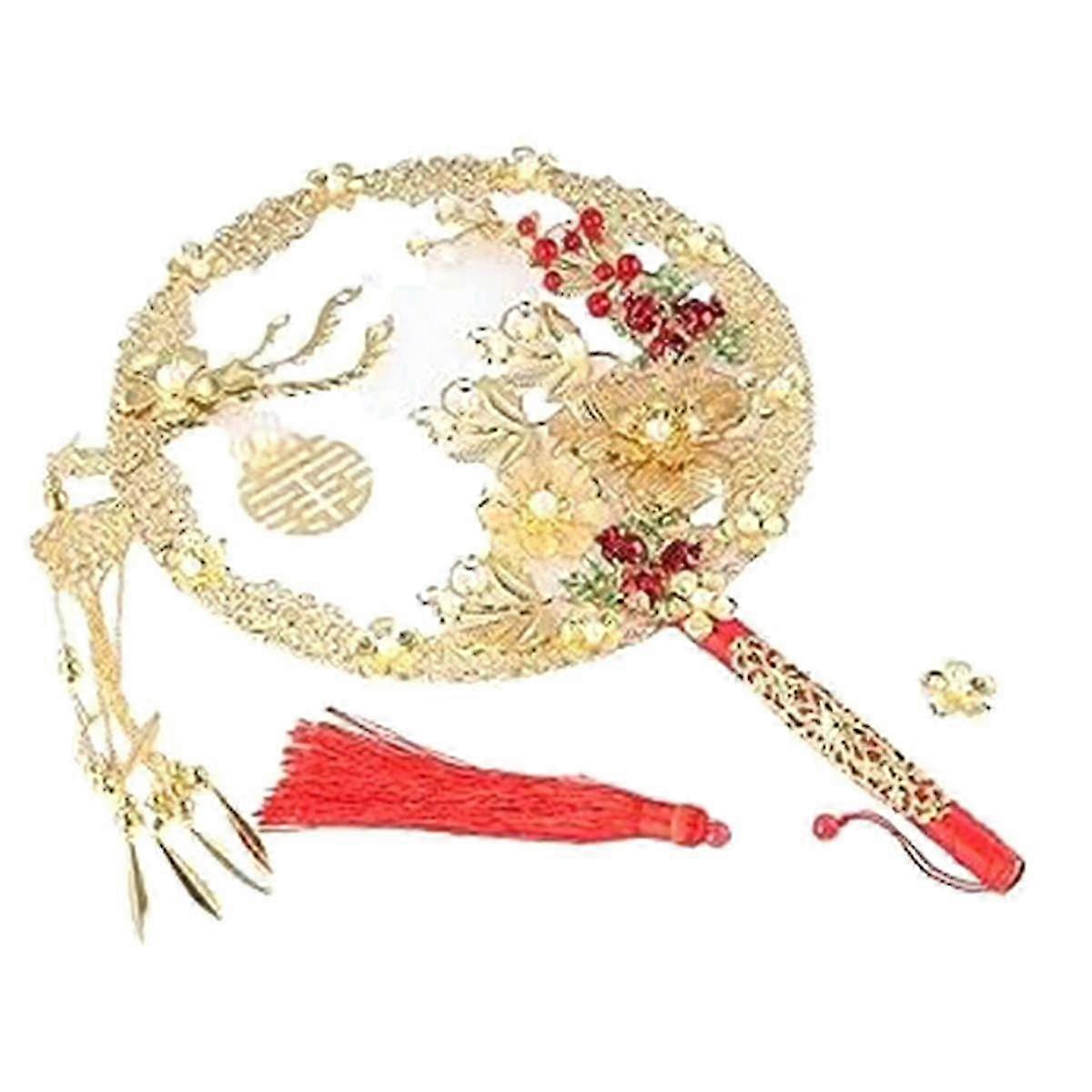 Vintage Chinese Round Wedding Fan with Phoenix Shaped Alloy Frame & Gold Floral Design for Bridal Events