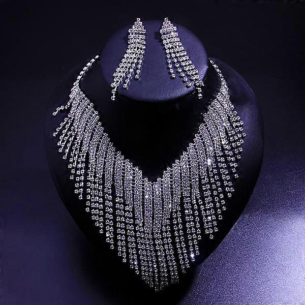 Bridal Silver Necklace Earrings Set Crystal Wedding Jewelry.