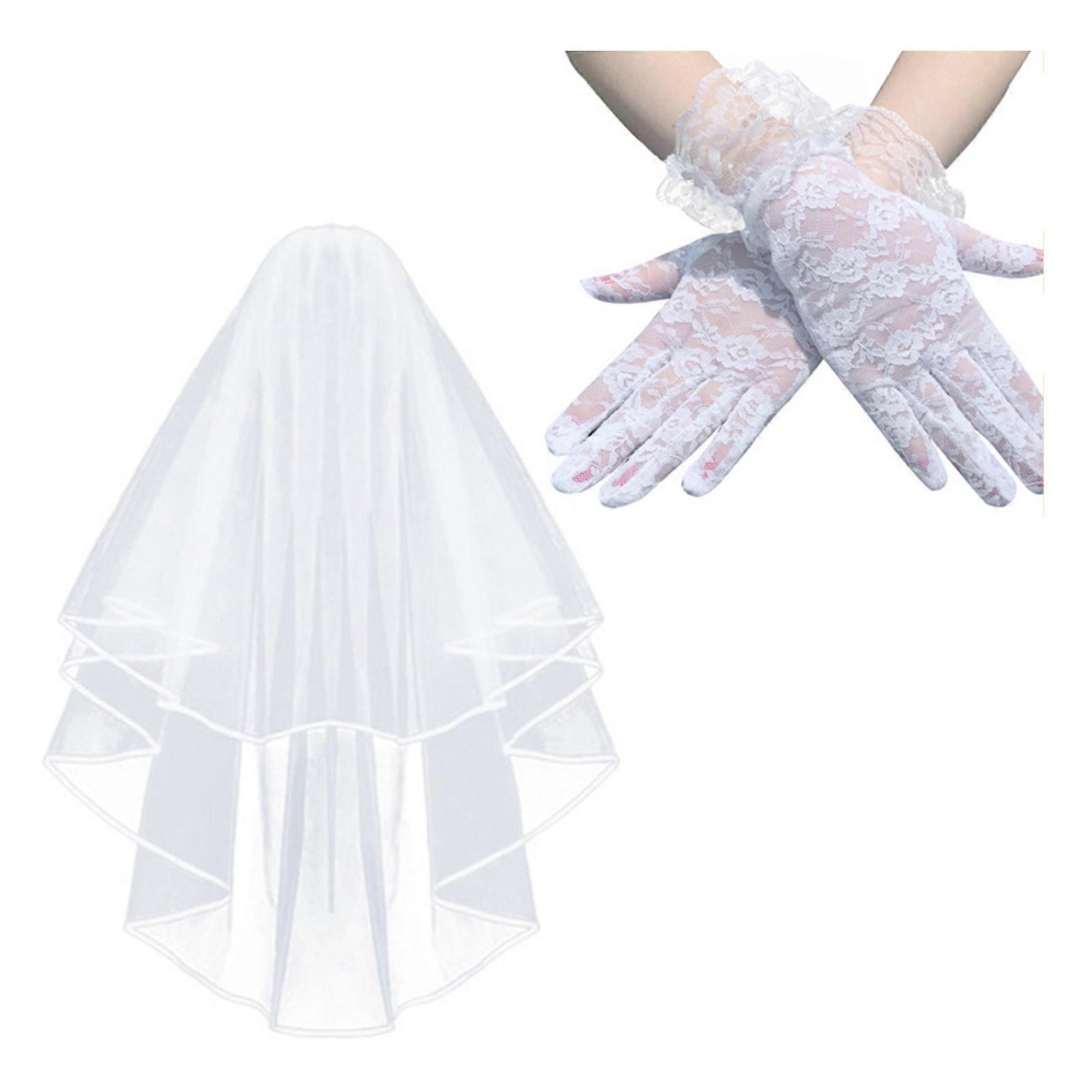 Bridal Veil Gloves Set Tulle Elegant Full Finger Gloves 1920s Women White Gloves Bridal Wedding Gloves White
