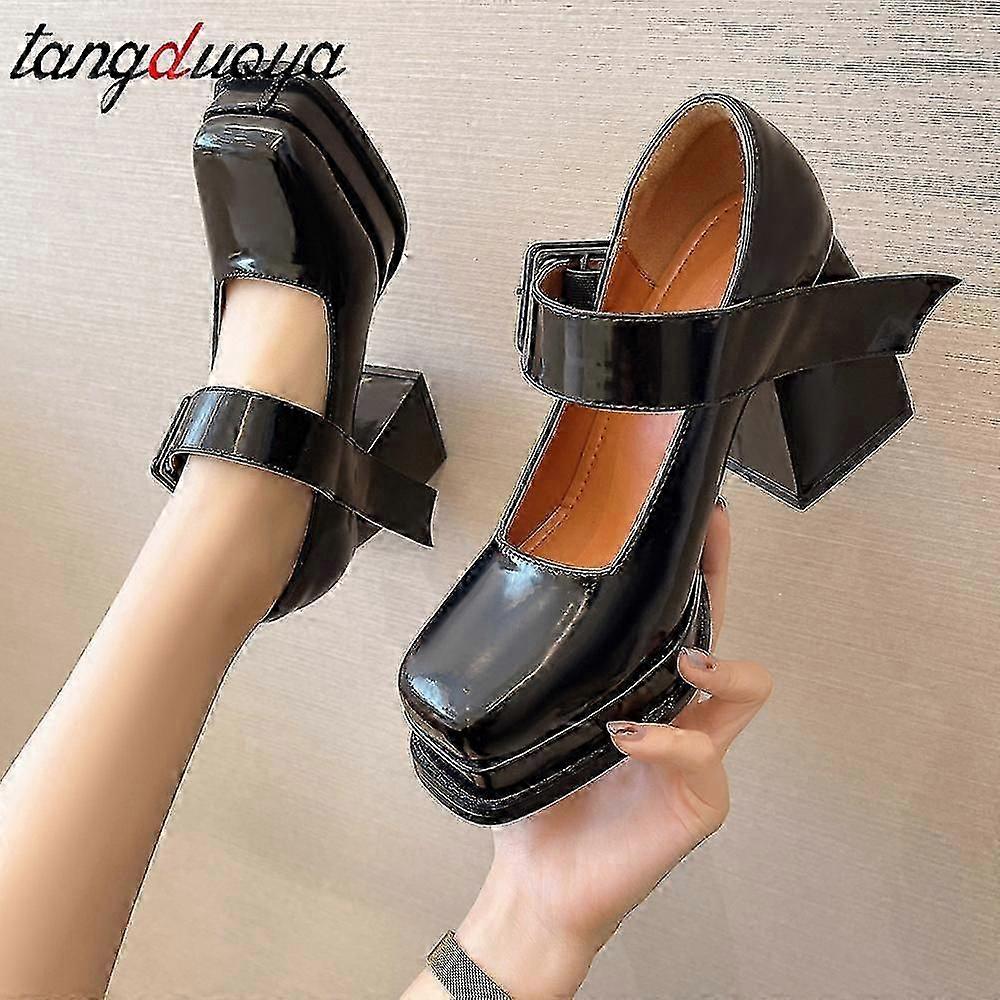 Black Punk Chunky Designer Platform Mary Janes Heels Shoes Women Patent Leather Square Toe Goth High Heels Women Pumps