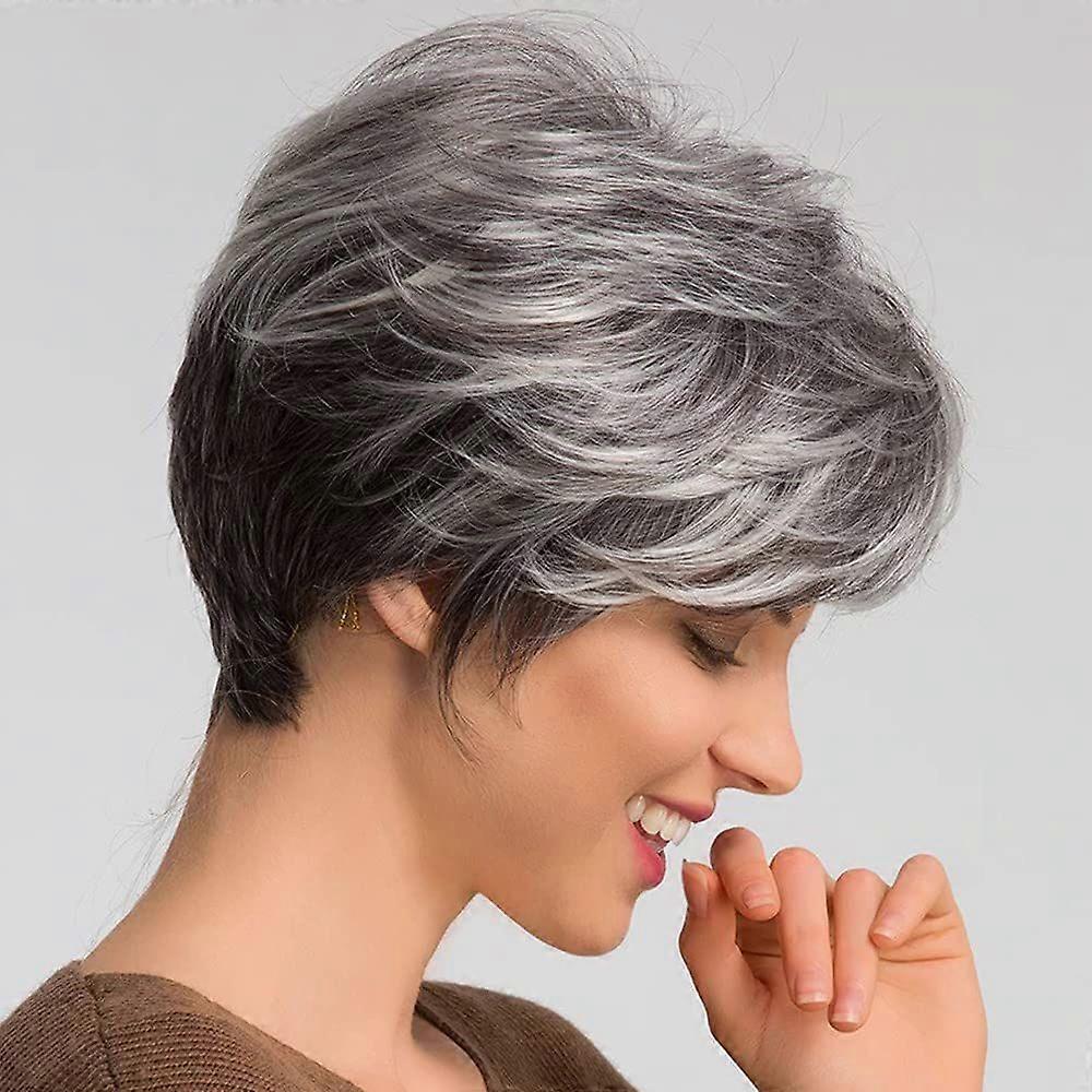Black Mixed Grey Wig Short Pixie Wig Synthetic Fluffy Hair Wigs