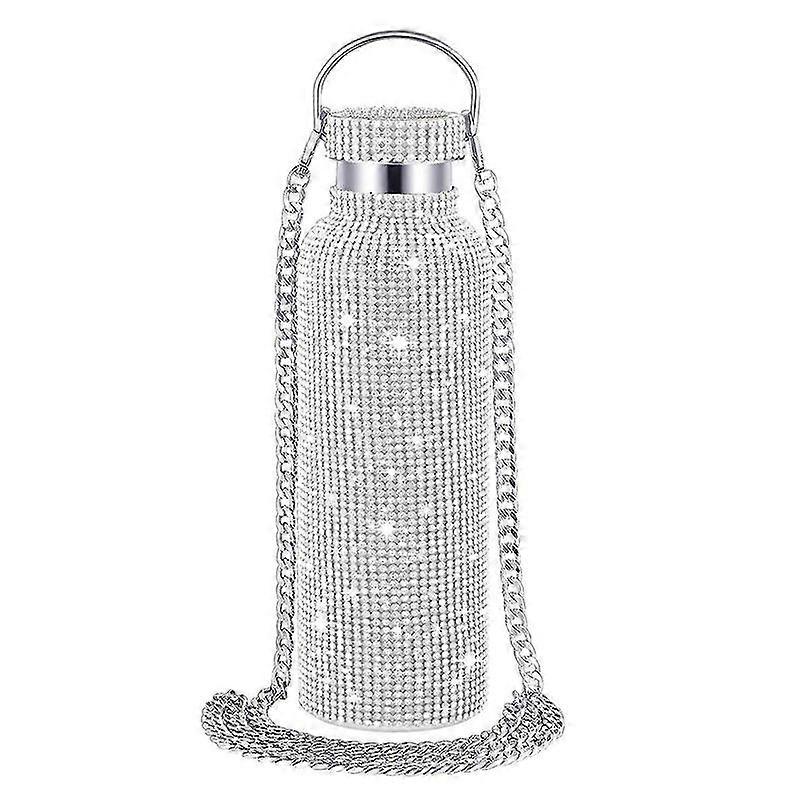 Bling Water Bottle Silver Rhinestone Glitter Bottle with Chain Rhinestone-Encrusted Stainless Steel
