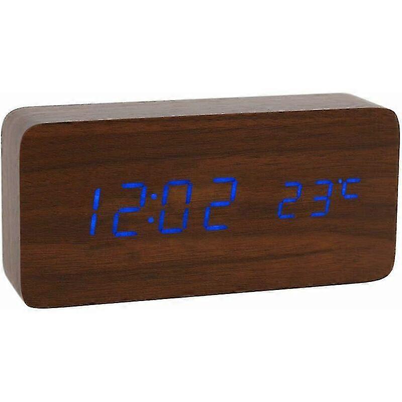Blue Dream Brown Blue Wooden Digital Clock - Multifunction Led Alarm Clock With Time/date/temperature Display And Voice Control For Home Travel