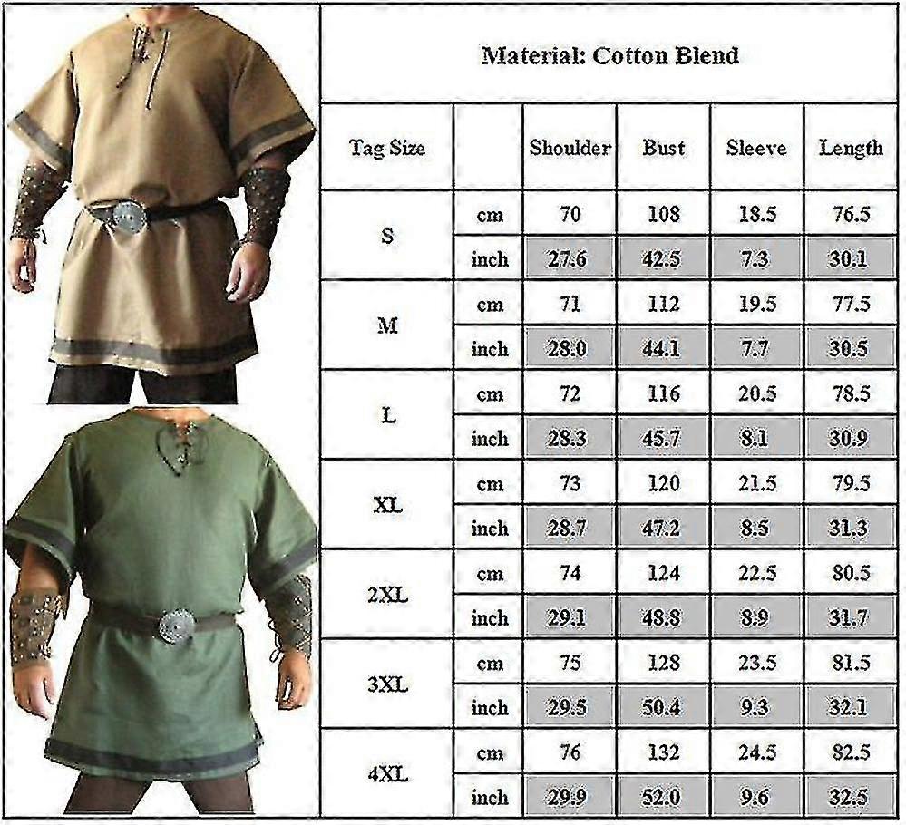 Description Plus Size Retro Mens Medieval Viking Knight Warrior Shirts Tops Cosplay Costume Product Information Material: Cotton Blend Package Included: 1 x Men Tops (Without Belt) Note: 1. Due to the different monitor and light effect, the actual color of the item might be slightly different from the color showed on the pictures. Thank you 2. Please allow 1-3cm measuring deviation due to manual measurement. ( 1 inch = 2.54 cm )