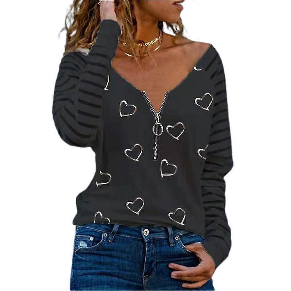 Plus Size Women Tops Printed Long Sleeve Zip V Neck Casual T-shirt