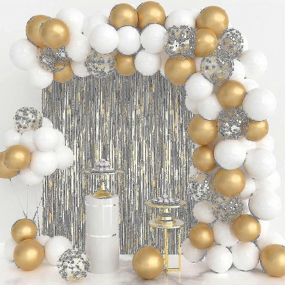 Package Included: Your order contains 100pcs of Premium Metallic Gold Balloons and White Balloons, 10pcs of Gold Confetti Balloons, 1pc of Gold Wire Curtains, Balloon Garland Accessory Kit (Tie Tool, 16ft Balloon Decorative Strips, 1 Roll of Balloons glue dots + 16ft gold ribbon).EASY TO USE: The Balloon Tie Tool helps tie balloons on your fingers easily, quickly and painlessly. Insert the balloon into the hole in the tape or into the groove on the clip. It doesn't fall out of a set of holes. Just peel the button off the adhesive sheet and stick to the target.WIDE APPLICATIONS: This Platinum Balloon Arch Kit with Wire Curtains is perfect for birthdays, weddings, anniversaries, engagements, store openings, corporate events, photo shoots and any special event. Decorate a party at home or anywhere as a photo booth backdrop and create lasting memories.