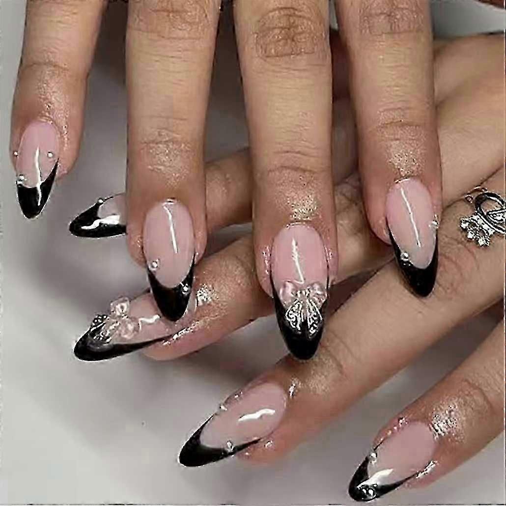 Press on Nails Medium Pearl Black Fake Nails Almond Glossy 3D False Nail Tips