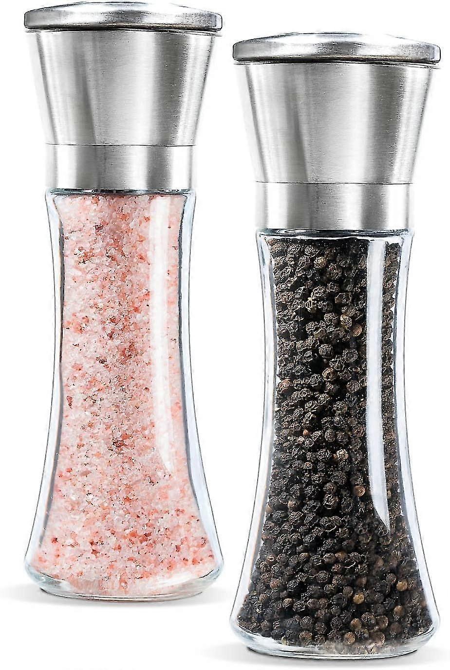 Premium Salt And Pepper Grinder Set - Brushed Stainless Steel Pepper Mill And Salt Mill, 6 Oz Glass Tall Body (2 Pack)