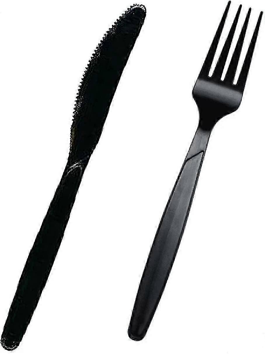 Premium Heavy Duty Reusable Black Plastic Cutlery Set - 100 Forks & 100 Knives for Parties, Events, Daily Dining