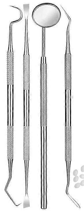 Professional and Useful Kit: This professional dental hygiene kit is made of stainless steel for the best dental care at home. Prevents tartar formation by removing plaque. Use it regularly to fight bad breath.Pack of 4 instruments: The kit includes the same type of surgical stainless steel used by dentists, a double-ended scraper, tweezers and a mirror as shown in the picture. Using the mirror allows for a better view of your mouth so you can easily see tartar on the back or front of your teeth.Proactive dental care: Think preventively and minimize expensive dental bills!Versatile dental hygiene kit: Pet dental care may also be needed.Set includes: 1 mouth mirror1 scraper with 2 flat scrapers2 scrapers with different pointed scrapersImportant! Don't forget to sterilize the tools before and after use to avoid the spread of bacteria.Note: For hygiene reasons, products with damaged packaging cannot be returned or exchanged.