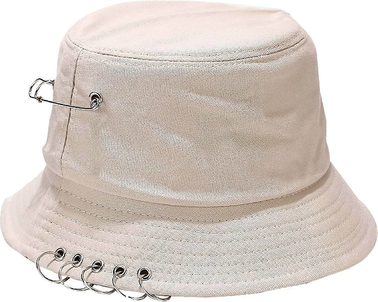 Five Ring &Safety Pin Decor 100% Cotton Bucket Hat Packable Beach Sun Hat for Womens Men Beige -