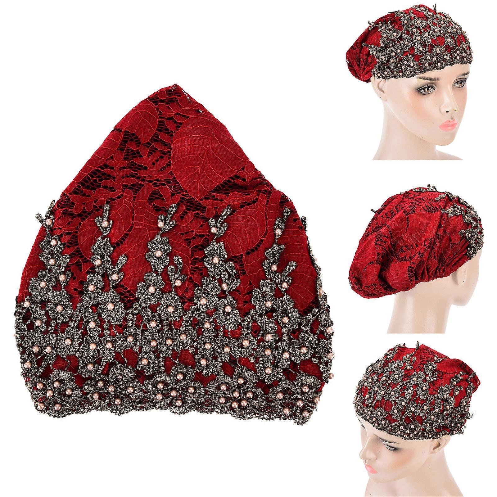 Fashionable Women's Maroon Lace Beaded Head Wrap Turban - Free Size