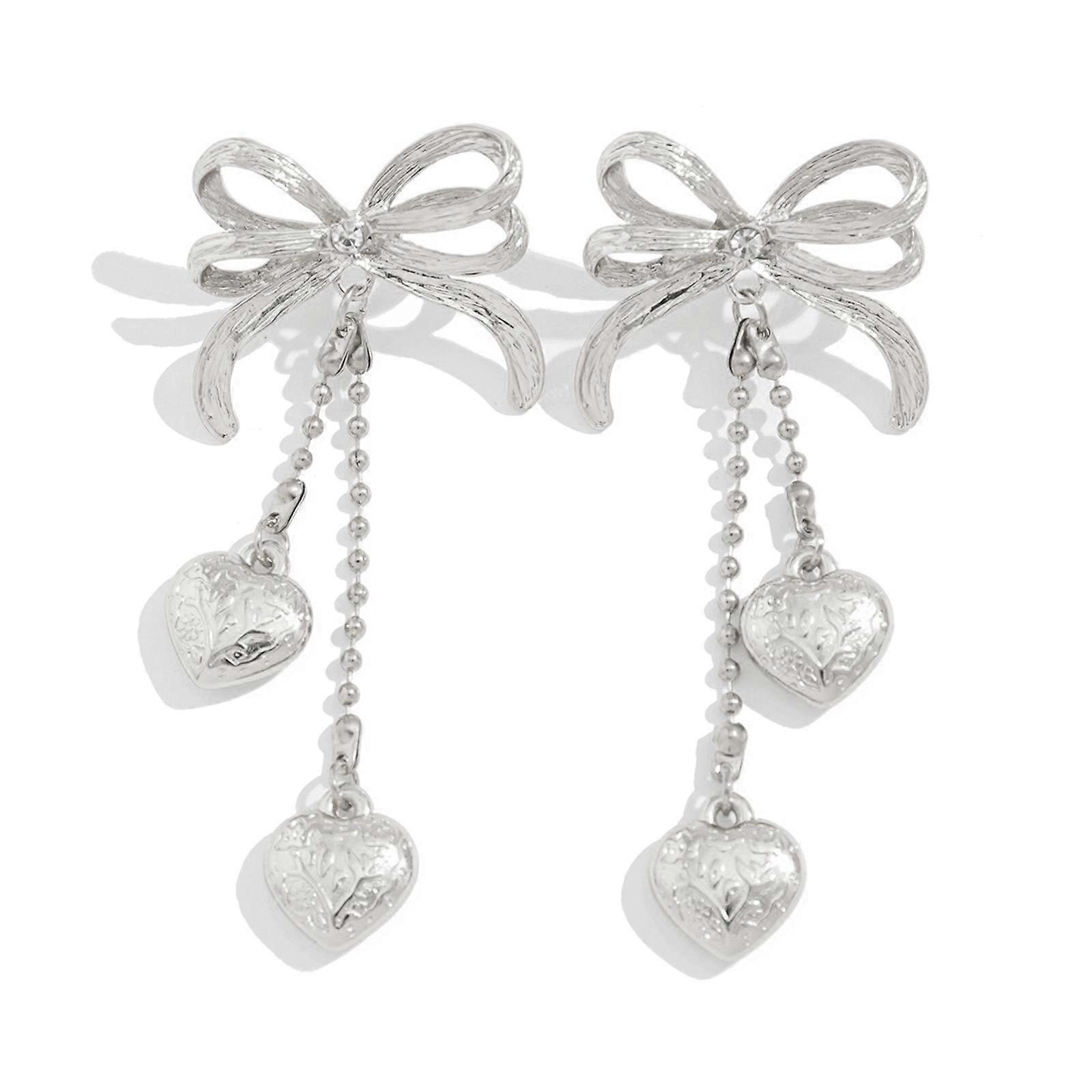 Features: Bowknot drop earrings combine elegant bowknot shaped pendants with delicate tassels, crafted from alloy for lasting shine and comfortable all day wear. These lightweight fashion earrings feature a alloy construction with secure butterfly backings, offering tarnish resistant durability perfect for sensitive skin. Designed for women seeking versatile accessories, these trendy bowknot earrings effortlessly complement both casual outfits and formal evening attire. Ideal for enhancing your look at weddings, office meetings, or weekends brunches, the eye catching bowknot and tassels design adds feminine charm to any occasion. These jewelry pieces make thoughtful presents for birthdays, anniversaries, or self pampering moment, blending elegances with modern trends. Specifications: Material: Alloy Size:Approx. 8.5cm/3.34inch Color:Gold/Silver Package Includes: 1 pair Earrings note: 1.Please allow 1-2cm errors due to manual measurement, making sure that you will not mind before order. 2.Due to the differences between different monitors, the picture may not reflect the actual color.