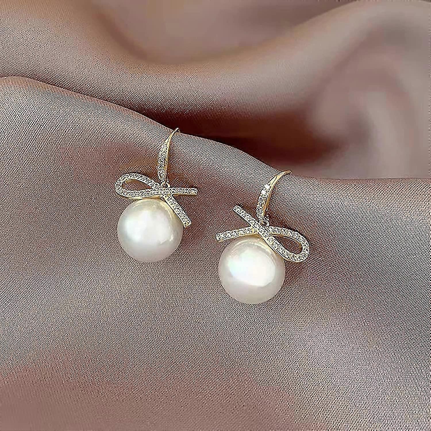 Fashion Earrings Simulated Red Pearl Bow Earrings Charm Girl Gold Plated Banquet Rib