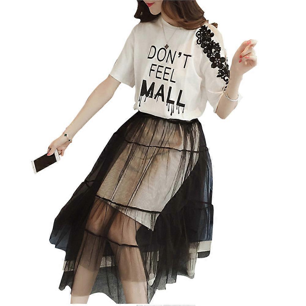 Fashion Off Shoulder Casual Short Sleeve t shirt Hollow Tulle Skirt Suits(White M)