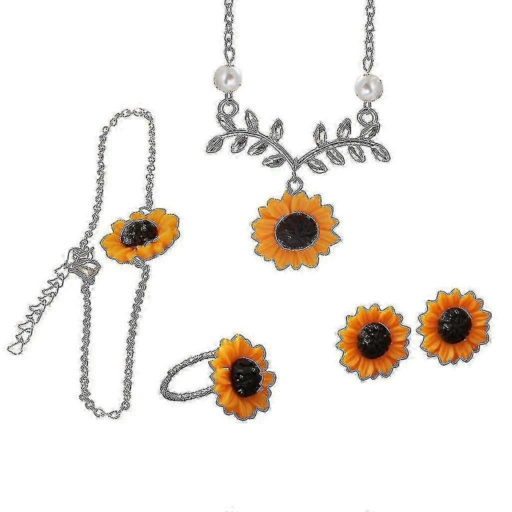 Fashion Trend Sunflower Leaves Four-piece Bracelet Earrings Ring Necklace Jewel-XK11693